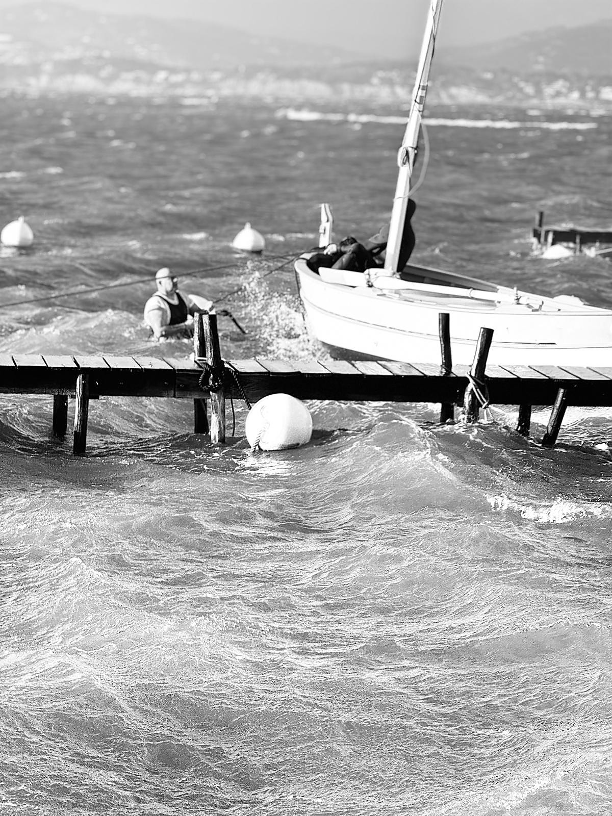 La tempête Nils est d'une rare ampleur, après le Sud Ouest elle a gagné la Méditerranée, nos pointus dans la lagune subissent en ce moment des rafales de 60 nœuds, heureusement que nous sommes abrités des très grosses vagues par l'île des Embiez, il n'empêche que nos bateaux souffrent dans un vilain clapot. Depuis début d'après midi c'est le branle bas, on se tient informés en temps réel entre nous prêts à intervenir si il faut, il y en a qui ont mis les combis et se sont jetés à l'eau pour sauver 2 bateaux de la casse, en calculant les risques bien sûr mais quelle belle nanoeuvre, bravo à eux, chapeau bas à Michel, Joël, Lionel, David et à Didier (notre président), toujours prêts à mouiller la chemise.